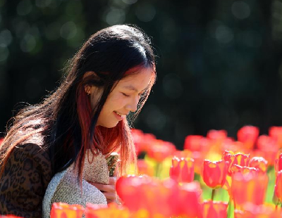 市民在小南海吊桥上游玩,欣赏映山红美景。新华网发(杨敏摄)