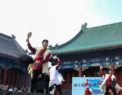 7月11日,在遵义开往重庆西的5630次列车上,工作人员表演民俗舞蹈。