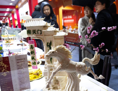 2月17日,志愿者为等待过海的旅客派送食品。新华社记者 郭程 摄