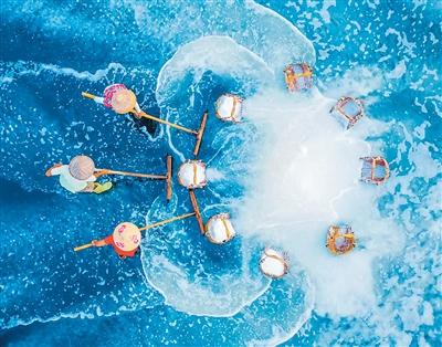 盐农们穿梭其间,有的手持长绳在池中“打花”,促进结晶;有的用木耙将析出的盐粒推拢,动作沉稳娴熟。“晒盐靠天吃饭,趁着天晴要抓紧生产。”盐农方学正说,夏季是采收旺季,尽管眼下气温低、结晶慢,但必要的劳作四季不歇。