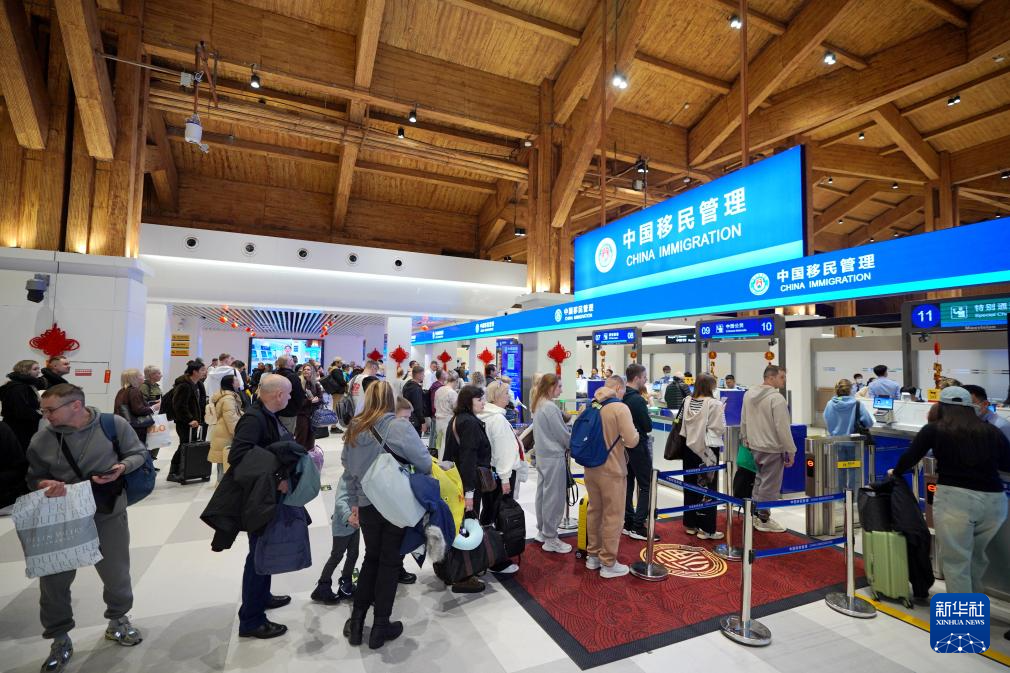 2月23日,旅客在三亚凤凰国际机场边检大厅排队候检。