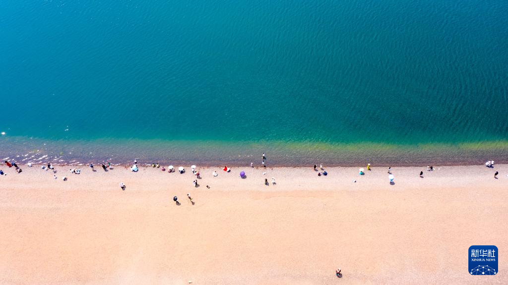 4月18日,游客在抚仙湖畔游玩(无人机照片)。