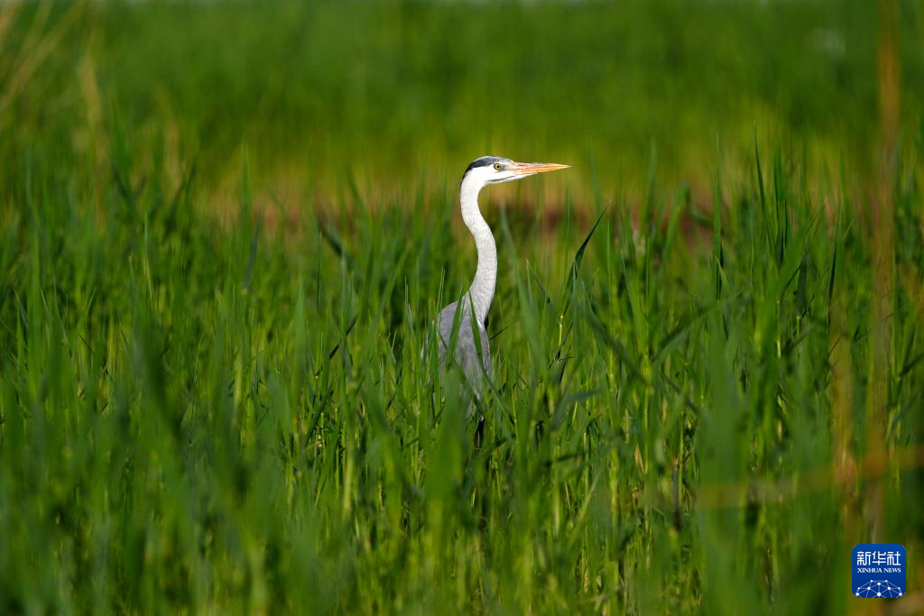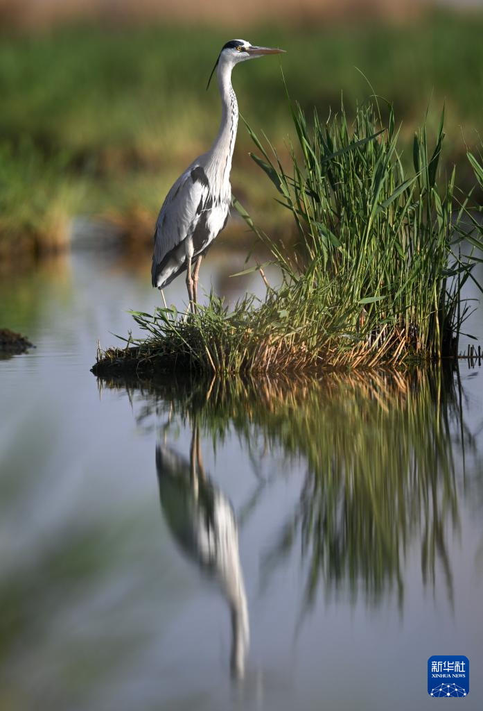 4月17日,苍鹭在沙湖中栖息。