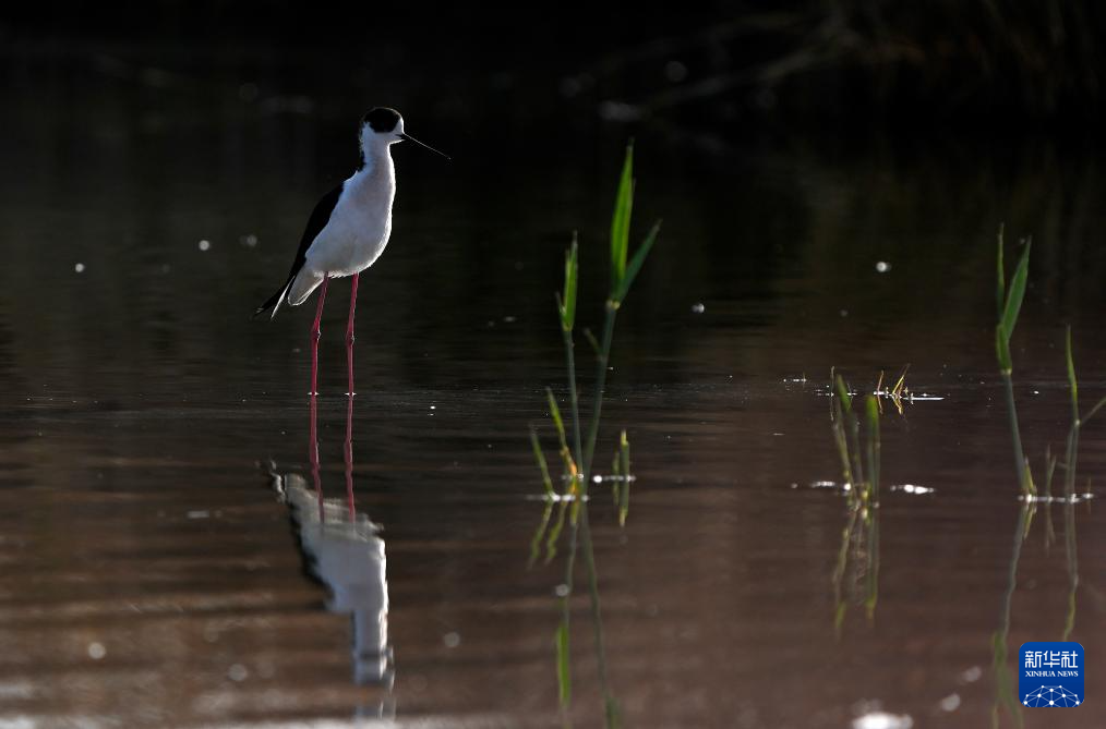 4月18日,一只黑翅长脚鹬在沙湖水域中觅食。