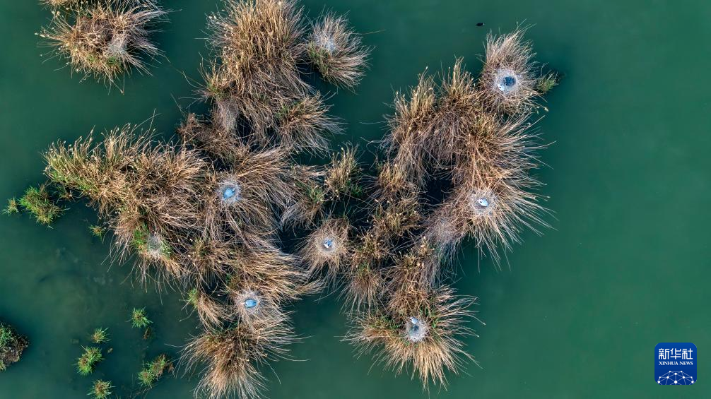 这是4月17日在沙湖拍摄的苍鹭鸟巢(无人机照片)。