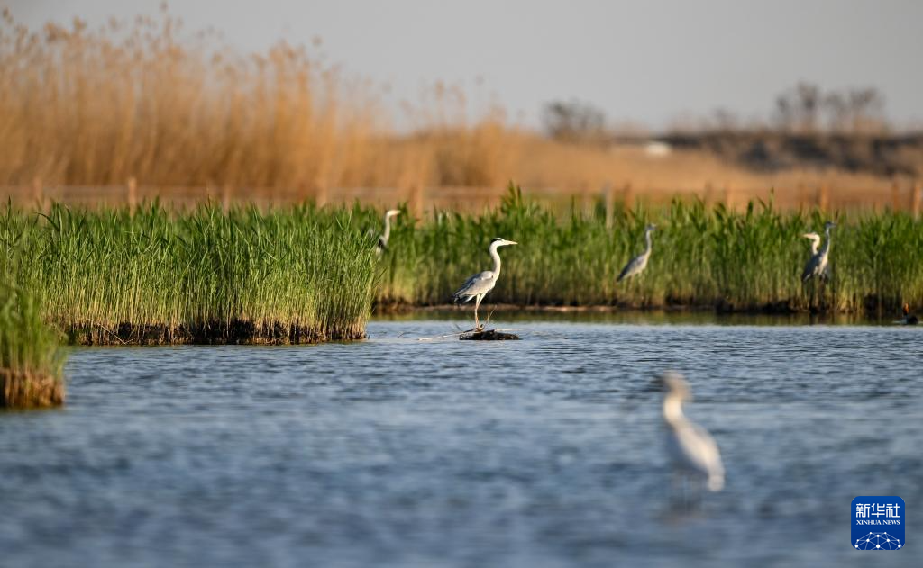 4月18日,苍鹭在沙湖中栖息。